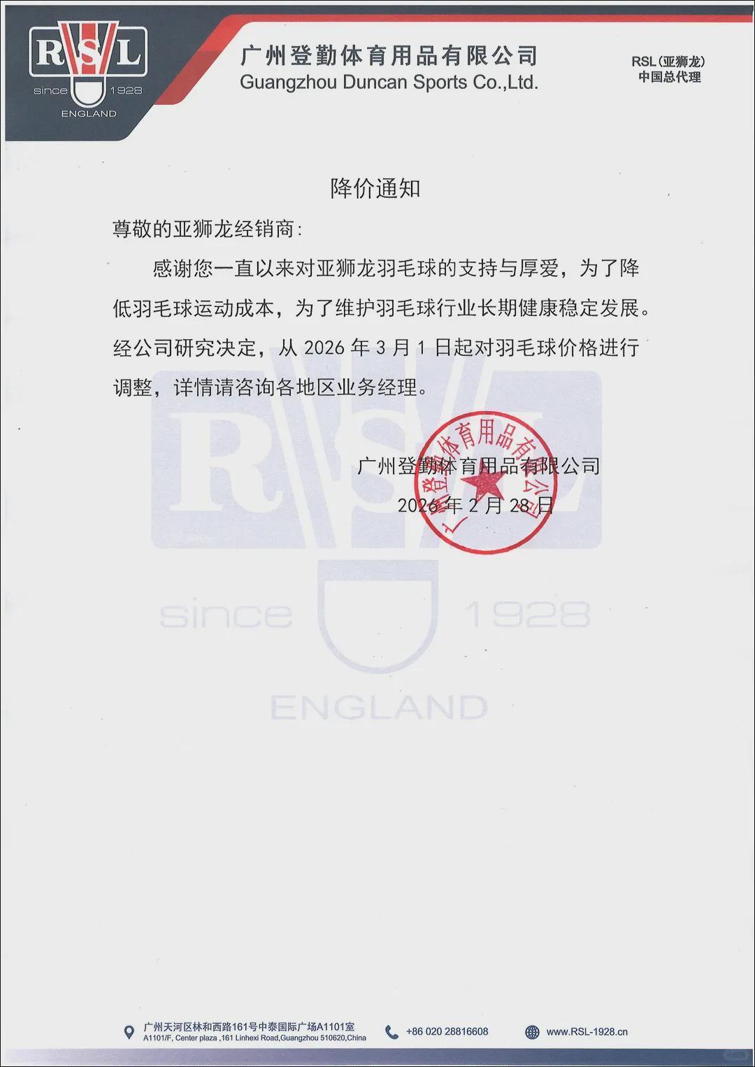 2月28日,羽毛球的龙头企业亚狮龙,也发布了降价通知。超牌、威肯……不少品牌陆续跟上降价的步伐。尤尼克斯(YONEX)至今未发布官方降价通知,但终端价格已随库存消化开始松动。