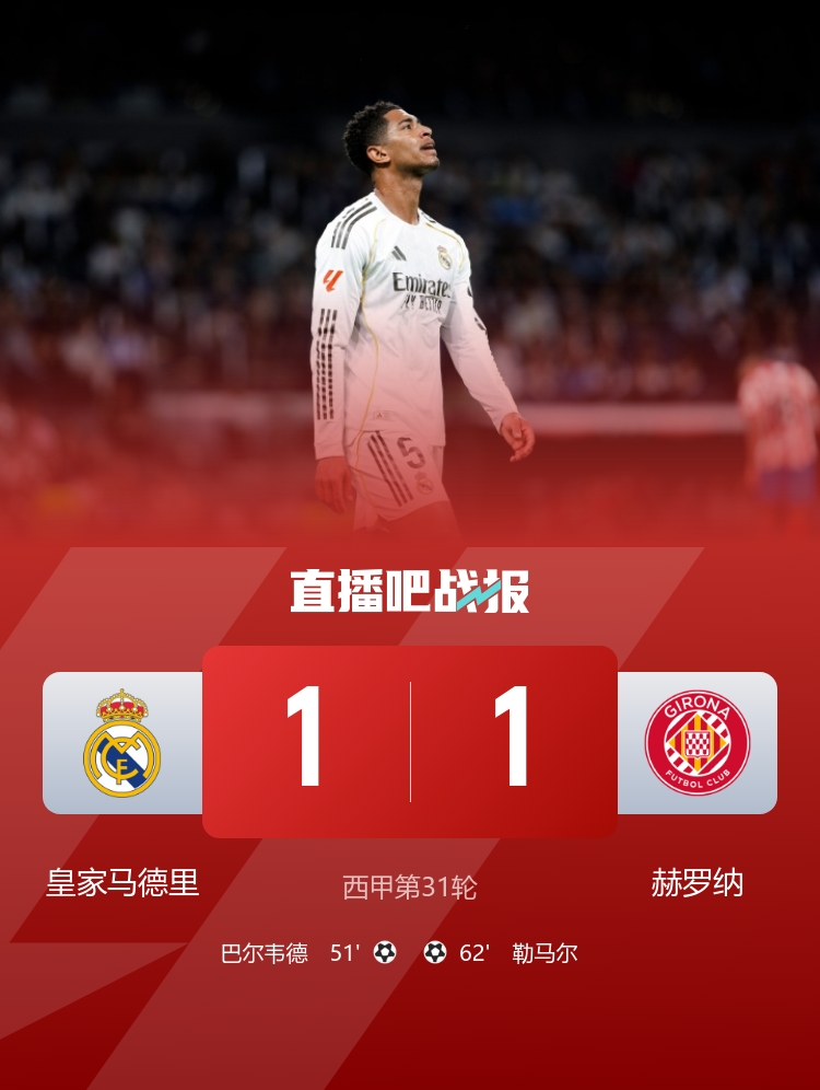 皇马主场1-1战平赫罗纳,皇马遭遇各赛事3场不胜,先赛积70分位居第2名,距榜首巴萨6分。
