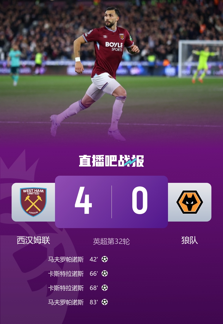 主场5轮不败!西汉姆联4-0狼队领先降级区2分 卡斯特拉诺斯双响