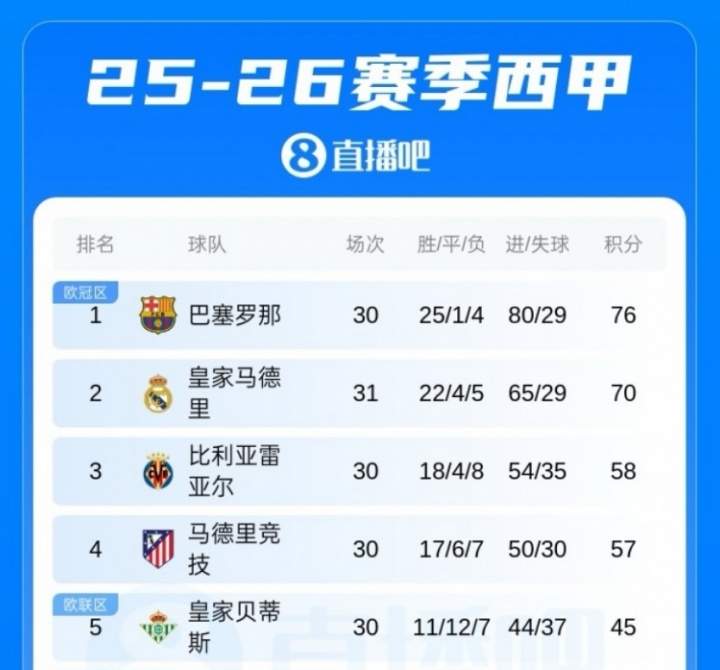 西甲第31轮,皇马主场1-1战平赫罗纳。看看最新积分榜的情况。