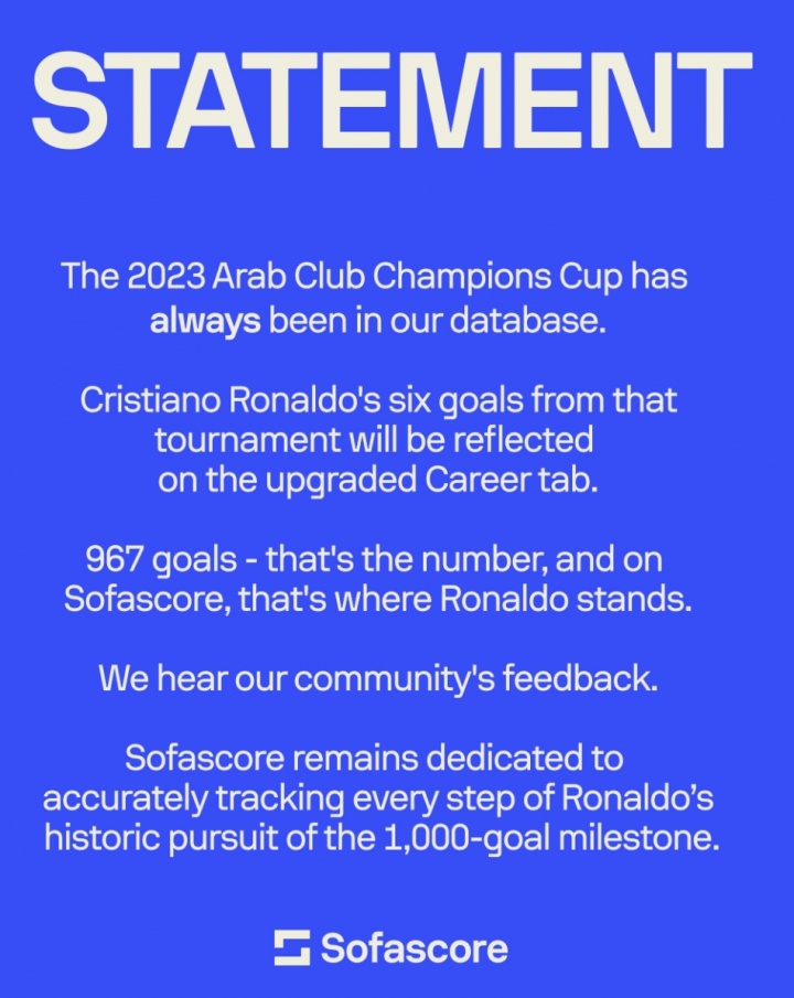 球迷反馈称sofascore找不到C罗阿拉冠的进球,如今sofascore如今发布公告做出回应。