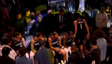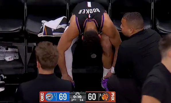 比赛的第三节,布克无球跑动被多尔特绊倒,目前已经返回更衣室治疗。