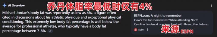 迈克尔-乔丹在其职业生涯中以极低的体脂率著称,据不同来源报道,他的体脂率曾低至4%或5%左右。